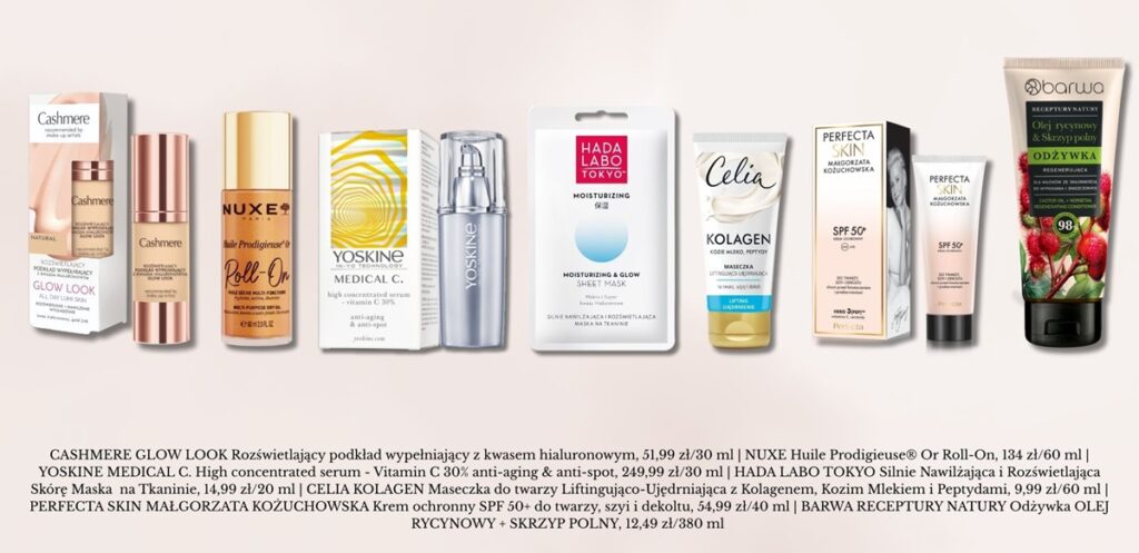 Wypróbuj: CASHMERE GLOW LOOK Rozświetlający podkład wypełniający z kwasem hialuronowym, 51,99 zł/30 ml | NUXE Huile Prodigieuse® Or Roll-On, 134 zł/60 ml