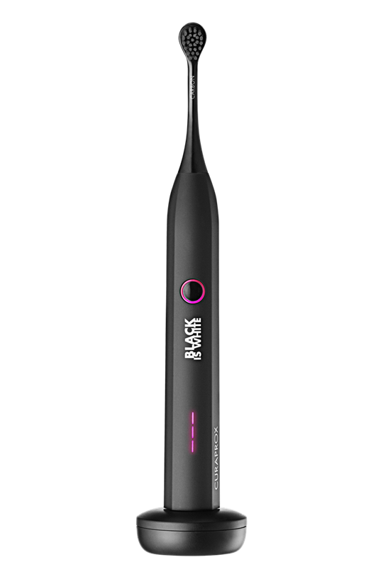 - Matowo czarna soniczna szczoteczka Hydrosonic Black is white ma ultracienkie włókna Curen® pokryte cząstkami aktywnego węgla. Dzięki temu zapewniają jednocześnie delikatne, ale skuteczne czyszczenie oraz wybielanie zębów. Jeden intuicyjny przycisk pozwala na przechodzenie między trybami pracy, a wytrzymała bateria zapewnia dwa tygodnie szczotkowania przez cztery minuty dziennie. (755 zł)
