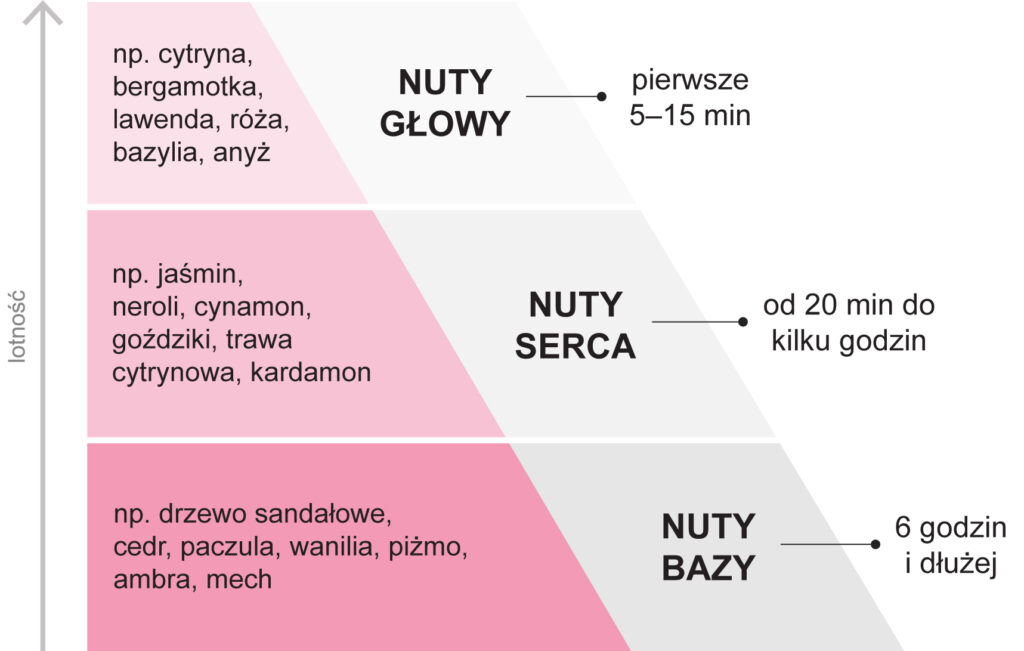 Sercem receptury kompozycji zapachowej są składniki, które mogą pochodzić ze źródeł naturalnych – takich jak olejki eteryczne, ekstrakty roślinne czy absoluty – lub być syntetyzowane w laboratoriach. Każdy ze składników receptury charakteryzuje się innymi nutami zapachowymi, które następnie przedstawiane są w formie tzw. piramidy zapachowej. Dzieli ona składniki na trzy grupy, w zależności od ich lotności i czasu uwalniania: nuty głowy, nuty serca i nuty bazy5–7.
