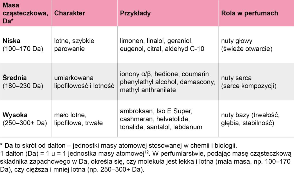 Z kolei związki wykazujące większe powinowactwo do fazy wodnej cechują się niższą masą cząsteczkową, co sprzyja szybszej dyfuzji i krótszemu czasowi utrzymywania się zapachu. To właśnie one odpowiadają za nuty głowy – pierwsze wrażenie zapachowe, nadające kompozycji świeżość i lekkość10,12-14. W tabeli 1 przedstawiono porównanie masy cząsteczkowej, lipofilowości oraz funkcji poszczególnych nut w strukturze zapachu.