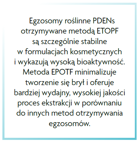 Egzosomy pochodzenia roślinnego tzw. PDENs wykorzystywane w produktach kosmetycznych otrzymuje się dzięki nowoczesnym technologiom. Południowo – koreańska firma INCOSPHARM opracowała nowatorską technologię izolacji egzosomów z wykorzystaniem procesu ultrafiltracji z przepływem stycznym wspomaganym oscylacjami elektroforetycznymi (EPOTF – Electrophoretic Oscillation assisted Tangential Flow Filtration). Technologia ta wykorzystuje nanofiltr pokryty włóknem PVDF, który zapobiega zatykaniu i aglomeracji biocząstek, utrzymując stałą wydajność filtracji przy różnych napięciach i cyklach pracy. Analizy biochemiczne potwierdziły wysokie stężenie i integralność strukturalną egzosomów izolowanych metodą EPOTF.