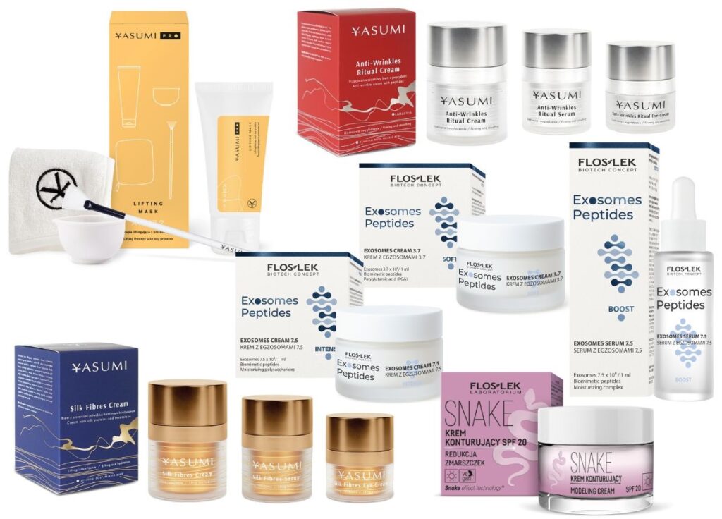 4/ Krem z egzosomami do twarzy zwiększający gęstość skóry INTENSE 7.5 z linii Exosomes Peptides FLOSLEK Biotech Concept – efektywne stężenie kompleksu trój- i tetrapeptydów biomimetycznych przekłada się na efekt zwiększenia gęstości skóry, a co za tym idzie zawartości kolagenu. Moc 750 milionów egzosomów pozyskiwanych z komórek macierzystych Centella asiatica w 1 ml kremu sprawia, że krem wygładza, liftinguje, napina skórę, intensywnie odżywia, regeneruje. Dodatkowo zawiera polisacharydy z drzewa Tara, masło shea oraz oleje z oliwek i moreli. Cena 64,99 zł/50 ml.
