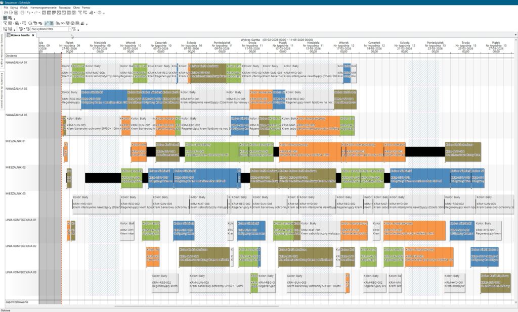 Największym wrogiem efektywności w produkcji kosmetyków jest przezbrojenie (Changeover). Proces mycia przemysłowego mieszalnika o pojemności 500 kg po produkcji ciemnej masy z drobinkami peelingującymi, aby przygotować go do produkcji jasnego, hipoalergicznego kremu pod oczy, jest procesem skomplikowanym. Trwa często kilka godzin, obejmuje demontaż elementów, zużywa setki litrów gorącej wody i drogich środków chemicznych, a następnie wymaga walidacji czystości mikrobiologicznej (wymazy). Podobnie wygląda sytuacja na liniach pakujących: wymiana formatów z butelki okrągłej na kwadratową, regulacja etykieciarek i kartoniarek to kolejne godziny postoju. Inaczej mówiąc, przezbrojenia wynikające z dużej ilości form pakowania muszą zostać zsynchronizowane z przezbrojeniami, wynikającymi z charakteru procesu wytwarzania masy. System APS daje nam możliwość uwzględnienia różnych matryc przezbrojeń oraz innych dodatkowych uwarunkowań, które wpływają na ilość i czas przezbrojeń. Nie chodzi nam przecież o skrócenie czasu jednego przezbrojenia, ale o skrócenie sumy czasów lub/i ilości przezbrojeń. Jesteśmy w stanie zaszyć w nim informacje lub ograniczenia, które do tej pory były tylko w głowach pracowników firmy. A to na pewno wpływa na bezpieczeństwo organizacji. Nie jesteśmy uzależnieni od wiedzy i doświadczenia pracownika.