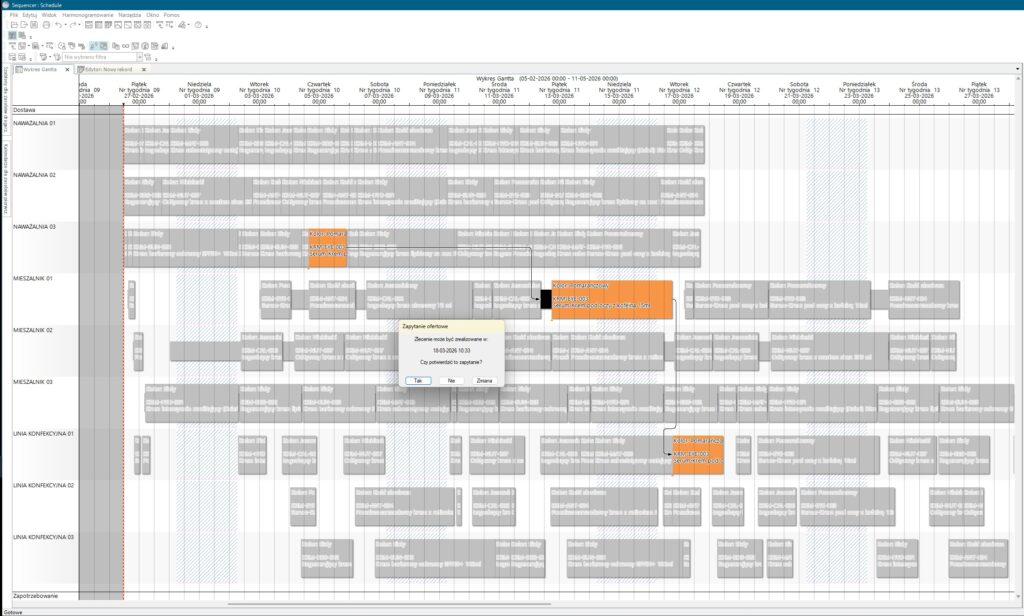 System APS weryfikuje dostępność tych zasobów przed zaplanowaniem zlecenia na wykresie Gantta. Jeśli brakuje oprzyrządowania lub ludzi, system nie pozwoli zaplanować produkcji w tym terminie lub wskaże konflikt zasobowy. Zapobiega to frustrującym sytuacjom, w których linia staje na początku zmiany, bo „okazało się”, że formaty są niedostępne.