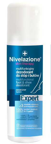 W ciągu długiego dnia stopy mogą mocno się spocić, co nie tylko sprawia dyskomfort, ale również może skutkować pojawieniem się nieprzyjemnego zapachu. Skutecznym rozwiązaniem na takie problemy jest Nivelazione Skin Therapy Expert Aktywny dezodorant do stóp 5w1. Dzięki technologii ODOUR STOP System neutralizuje on nieprzyjemny zapach, pozostawiając świeży i przyjemny aromat, który utrzymuje się przez długie godziny. Opracowana przez podologów i dermatologów formuła 5 w 1 zapewnia kompleksową ochronę: skutecznie redukuje pocenie, neutralizuje nieprzyjemne zapachy, zapewnia uczucie suchości aż do 24 godzin, działa antybakteryjnie i  przyjemnie chłodzi. Dzięki temu stopy są świeże, suche i komfortowe przez cały dzień – niezależnie od tego, co przyniesie kolejny krok! (150 ml/18 zł)