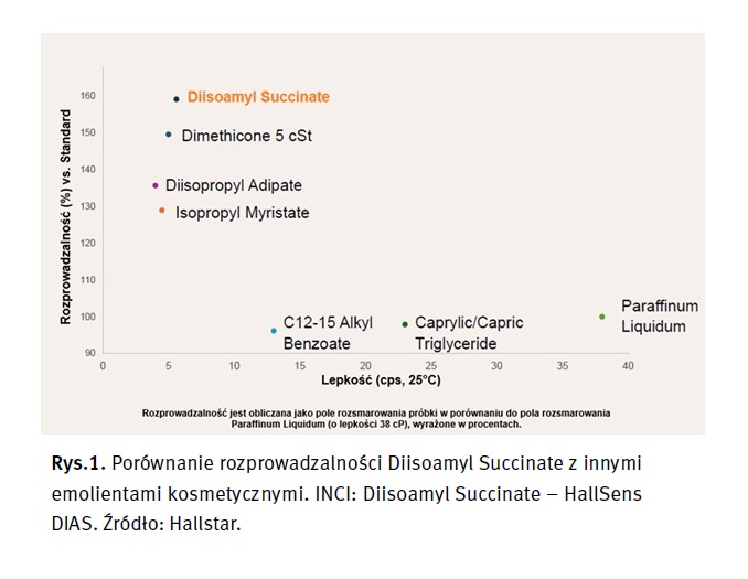Jednym z najnowszych emolientów dostępnych na rynku jest Diisoamyl Succinate, produkowany poprzez estryfikację z wykorzystaniem odnawialnego kwasu bursztynowego i alkoholu izoamylowego. Cechuje się lekkością porównywalną z lotnymi silikonami, świetną rozprowadzalnością, nie pozostawia tłustej warstwy okluzyjnej i szybko się wchłania.