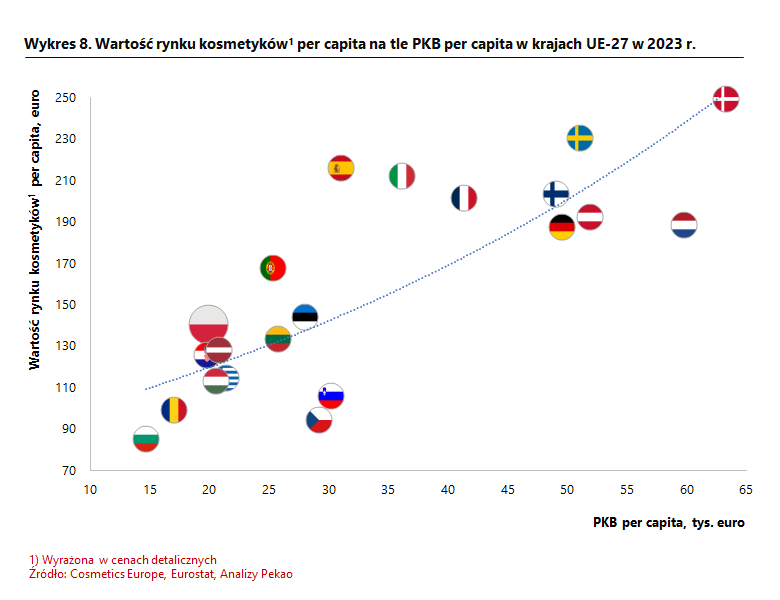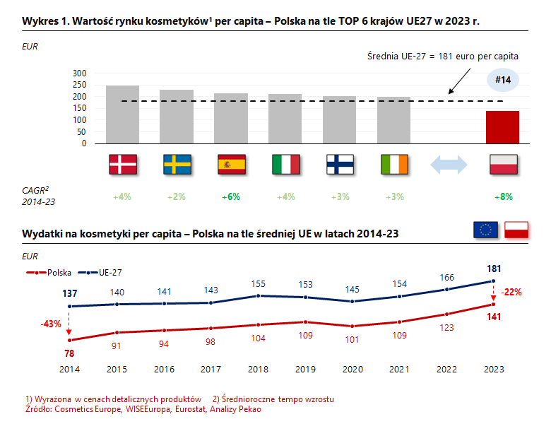 Według Cosmetics Europe, wartość polskiego rynku kosmetyków w 2023 r. wyniosła 5,2 mld euro, co plasowało nasz kraj na piątej pozycji w Unii Europejskiej. W ostatnich dziesięciu latach wartość ta rosła w szybkim tempie, o 6% średniorocznie, stawiając Polskę pod względem dynamiki przed większością głównych unijnych rynków produktów kosmetycznych. Wysoką pozycję zapewnia naszemu krajowi demografia i wysoka liczba nabywców – pod względem populacji Polska jest piątym największym krajem UE. Z kolei szybka dynamika jest pochodną wzrostu płac i dochodów, przekładającego się na „nadrabianie” dystansu względem zamożniejszych krajów zachodnich pod względem wydatków na kosmetyki per capita. W ciągu ostatnich lat zwiększyły się one w naszym kraju szacunkowo o ponad 60 euro rocznie (tzn. o 80%), podczas gdy średnio w UE-27 wzrost ten wyniósł niespełna 45 euro (+32%).