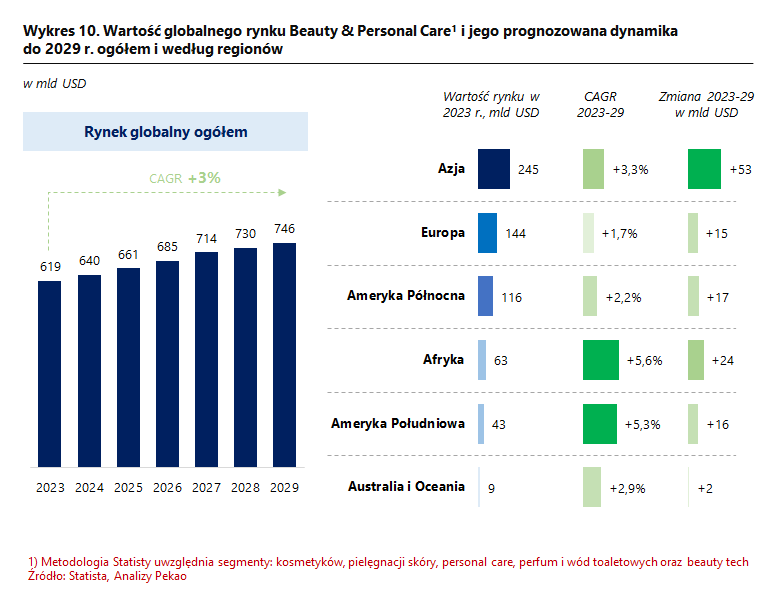 Druga potencjalna bariera popytowa może wiązać się z obecną strukturą geograficzną polskiego eksportu kosmetyków. Jak wspomniano wcześniej, udział krajów UE-27 w wartości polskiej sprzedaży zagranicznej tych wyrobów systematycznie rośnie – w 2023 r. osiągnął on już poziom 65%. Pozostała część przypada przede wszystkim na inne kraje europejskie, głównie Wielką Brytanię, Rosję i Ukrainę. Tymczasem globalne prognozy wzrostu wartości rynku produktów kosmetycznych wskazują Europę jako kontynent o najniższej dynamice trendu wzrostowego – znacznie szybciej rozwijać mają się rynki w Azji, Afryce i Ameryce Południowej (choć dwa ostatnie – przy wciąż relatywnie niskich na dzień dzisiejszy poziomach wyjściowych). W takich warunkach, przy silnej specjalizacji w sprzedaży na rynki europejskie, utrzymanie wysokiego tempa wzrostu eksportu kosmetyków z Polski może stawać się coraz trudniejsze. Pożądane w związku z tym wydaje się odważniejsze poszukiwanie alternatywnych rynków zbytu. Teoretycznie najbardziej atrakcyjne w tym kontekście wydają się kraje azjatyckie, charakteryzujące się nie tylko wysoką dynamiką rynku kosmetycznego, lecz także szybko zwiększające w ostatnich latach import tych wyrobów z Europy. Kraje te posiadają jednak wysoko rozwiniętą, własną produkcję wyrobów kosmetycznych, a z importu sprowadzają w dużej mierze topowe światowe marki, przeznaczone na najwyższe półki cenowe. To z kolei może oznaczać dla polskich eksporterów wysokie bariery wejścia, związane z koniecznością budowy rozpoznawalności własnych marek. W związku z powyższym, ciekawszą alternatywą mogą okazać się Afryka i Bliski Wschód. Wartość tamtejszych rynków jest wprawdzie na dzień dzisiejszy dość niska, jednak szybko rośnie dzięki trendom demograficznym i wzrostowi dochodów społeczeństwa. Jednocześnie, regiony te wykazują niedobory własnej produkcji kosmetyków w stosunku do zwiększających się potrzeb, w związku z czym są zainteresowane importem wyrobów na wszystkie półki cenowe. Polskie produkty mogłyby dobrze wpisywać się w oczekiwania tamtejszych, aspirujących konsumentów, jako gwarantujące jakość i markowość wyroby z Europy, dostępne w przystępnej cenie.