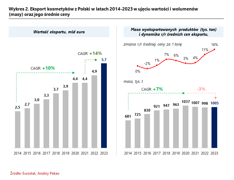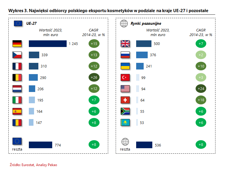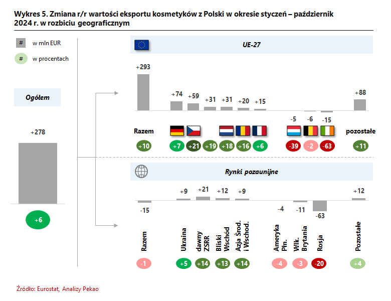 Polska jest też piątym największym eksporterem kosmetyków w Unii Europejskiej. Według Eurostatu, w 2023 r. wartość sprzedaży zagranicznej tych produktów z naszego kraju wyniosła 5,7 mld złotych i w ciągu dziesięciu lat rosła średnio o 10 % rocznie, a udział Polski w łącznym eksporcie wszystkich krajów unijnych zwiększył się do 8% z niespełna 7% w 2014 r. Głównym rynkiem zbytu pozostają inne kraje UE-27, przede wszystkim Niemcy, a w dalszej kolejności Czechy, Francja, Belgia, Holandia czy Włochy. Znaczenie wewnętrznego rynku unijnego wzrosło przy tym wyraźnie w ciągu ostatnich 10 lat – jego udział w całkowitej wartości polskiego eksportu zwiększył się z 55% w 2014 r. do 65% w 2023 r. Z drugiej strony, rynki pozaunijne pozostają ważnym kierunkiem sprzedaży zagranicznej, odgrywając w przypadku kosmetyków wciąż znacząco większą rolę niż to ma miejsce średnio w całym eksporcie dóbr przemysłowych z naszego kraju. Tutaj największym pojedynczym odbiorcą jest Wielka Brytania, jednak jeszcze większe znaczenie mają rynki krajów dawnego ZSRR, w których zaopatrywaniu Polska specjalizuje się od dawna. Jeśli chodzi o kierunek wschodni, to widać jednak wyraźnie trwające od kilkunastu lat zahamowanie wzrostu sprzedaży do Rosji, co częściowo rekompensowane jest zwyżką eksportu do innych krajów z tej grupy (w ostatnich latach – przede wszystkim do Ukrainy). W kontekście eksportu kosmetyków trzeba przy tym pamiętać, że jego wolumeny częściowo napędza reeksport produktów, sprowadzanych uprzednio zza granicy przez polskie firmy handlowe oraz do zlokalizowanych w naszym kraju, międzynarodowych centrów logistyczno-dystrybucyjnych.