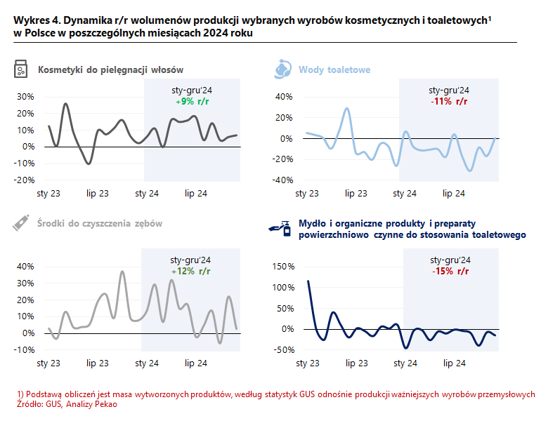 Rok 2024 przyniósł dość specyficzne uwarunkowania makroekonomiczne. Teoretycznie Polska gospodarka powróciła na ścieżkę szybszego wzrostu, przede wszystkim za sprawą ożywienia konsumpcji prywatnej. Jednak wzrost wydatków konsumentów był silniej odczuwalny przede wszystkim w segmentach skierowanych do nich usług, podczas gdy w przypadku szeregu przemysłowych dóbr konsumpcyjnych wsparcie to okazało się umiarkowane lub słabe. Również w skali całej Unii Europejskiej, pogrążonej w przedłużającej się stagnacji gospodarczej, lekki wzrost wydatków konsumpcyjnych, odnotowany w rachunkach narodowych, miał dość słabe przełożenie na sprzedaż znacznej części dóbr przemysłowych. Ten nietypowy rozkład popytu konsumpcyjnego miał wpływ na wyniki m.in. także przemysłu kosmetycznego – według danych Eurostatu, w okresie od stycznia do listopada 2024 r. łączny wolumen jego produkcji sprzedanej obniżył się o 3% w porównaniu z analogicznym okresem poprzedniego roku. W przypadku Polski, obserwowaliśmy jednak zróżnicowane trendy w różnych kategoriach produktów kosmetycznych. Jak wynika z danych GUS, spadki r/r zanotowała m.in. wartość produkcji wód toaletowych oraz mydła toaletowego (w całym 2024 r. o 11 i 16%), wzrosła zaś ona w przypadku kosmetyków do pielęgnacji włosów czy preparatów do czyszczenia zębów (odpowiednio o 9 i 12%).