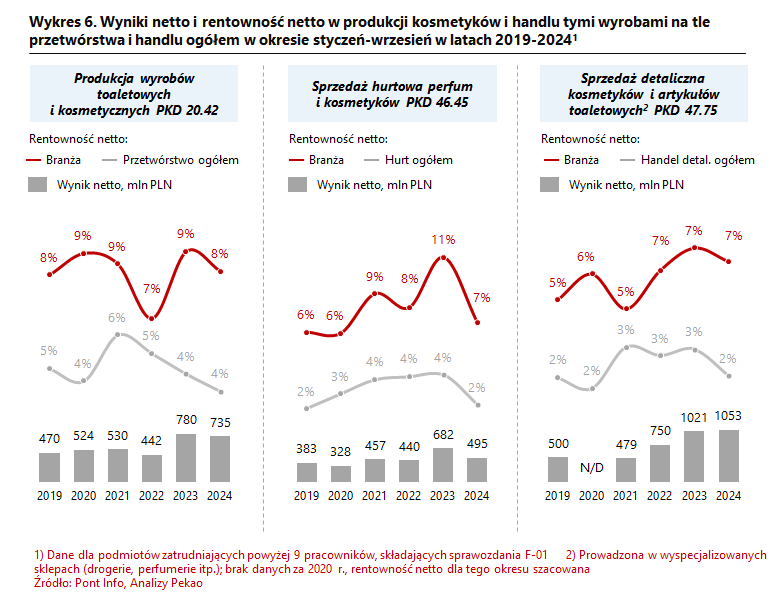 Trzeba podkreślić, że chociaż wysoka dynamika kosztów odbiła się negatywnie na wynikach finansowych branży, to kluczowe wskaźniki obrazujące jej marże i rentowność pozostały na bardzo solidnych poziomach. W handlu kosmetykami wskaźnik rentowności netto po trzech pierwszych kwartałach 2024 r. ukształtował się na poziomie 7% – nieznacznie niższym niż w analogicznym okresie poprzedniego roku (kiedy to wyniósł 8%), lecz wciąż wysoko na tle poprzednich lat. Z kolei w działalności produkcyjnej wskaźnik ten zniżkował do 8% z 9% przed rokiem, lecz również w tym przypadku pozostał relatywnie wysoki, patrząc z punktu widzenia poziomów osiąganych tu w poprzednich latach. Co szczególnie istotne, zarówno dystrybucja kosmetyków, jak i produkcja tych wyrobów, pozostały zdecydowanie wyróżniającymi się na plus wśród innych gałęzi przetwórstwa i handlu pod względem wyników, rentowności oraz ogólnej sytuacji finansowej. Można zatem stwierdzić, że na tle całego polskiego sektora przedsiębiorstw, branża kosmetyczna w 2024 r. radziła sobie bardzo dobrze z wyzwaniami stawianymi przez uwarunkowania gospodarcze.