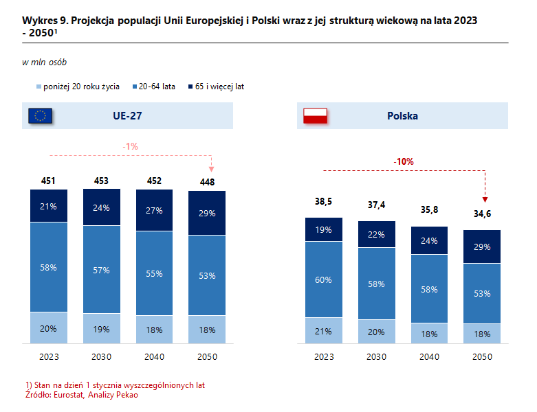 Osobną kwestią w kontekście długiego horyzontu są trendy demograficzne. Projekcje GUS i Eurostatu dla Polski pozostają pod tym względem zdecydowanie pesymistyczne. Wynika z nich, że do 2050 r. populacja naszego kraju może zmniejszyć się nawet o 10%, a udział osób w wieku 65 i więcej lat wzrośnie do blisko 30% z 19% w 2023 r. Proces ten może stanowić istotną, narastającą barierę popytową w odniesieniu do rynku krajowego, jako że spadek liczby potencjalnych nabywców może w coraz większym stopniu neutralizować korzystny wpływ rosnących wydatków na kosmetyki per capita. Do tego dochodzić będzie kwestia konieczności dostosowania portfolio produktów do potrzeb i oczekiwań starzejącego się społeczeństwa. Jeżeli trendy demograficznie nie ulegną zmianie, to branża może zacząć odczuwać silniej ich negatywne skutki już w latach trzydziestych obecnego wieku.