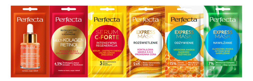 W ofercie marki PERFECTA znajdziesz maseczki, które odpowiadają na niemal każdą potrzebę skóry – od napięcia i jędrności, po regenerację i rozświetlenie.