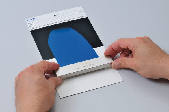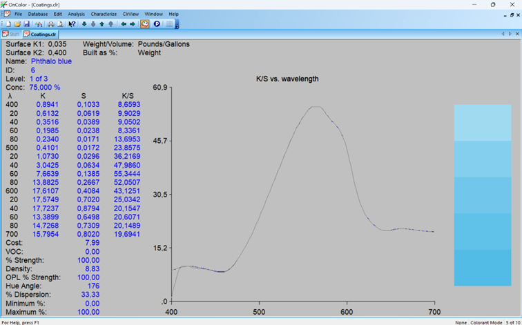 Jak wspomniano powyżej tworzenie bazy kolorantów jest jednym z najważniejszych etapów pracy z oprogramowaniem do recepturowania. Im dokładniej przygotujemy dane kolorymetryczne naszych wzorców, tym łatwiej i skuteczniej program będzie pracował na etapie korekt barwy wsadu. Tworzenie bazy polega na przemierzeniu spektrofotometrem naszych kolorantów w różnych koncentracjach (w oprogramowaniu Oncolor zalecane jest zastosowanie co najmniej 3 opcji koncentracji). Wynikiem takiego pomiaru jest zestaw krzywych wzorcowych opisujących relację koncentracji barwy i krzywą reemisji. Poniższa grafika (Fot. 3) pokazuje widok koloru niebieskiego w oprogramowaniu oncolor. Dodatkową informacją, jaką dostarczamy przy tworzeniu bazy jest siła krycia danego kolorantu. Dlatego tworząc bazę pracuje się na kartach testowych ze zdefiniowaną czernią i bielą, na przykład byko-charts BYK Gardner (fot. 2).