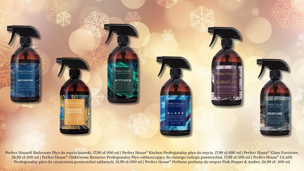 PRZEDŚWIĄTECZNE PORZĄDKI NIE MUSZĄ KOJARZYĆ SIĘ Z… „BRUDNĄ ROBOTĄ”. DOBRY PLAN I PRODUKTY UŁATWIAJĄCE SPRZĄTANIE SPRAWIĄ, ŻE PRZYGOTOWANIA DO ŚWIĄT STANĄ SIĘ… CZYSTĄ PRZYJEMNOŚCIĄ. KOSMETYKI DO WNĘTRZ PERFECT HOUSE® NIE TYLKO PERFEKCYJNIE CZYSZCZĄ, ALE TEŻ MAJĄ PERFUMERYJNE ZAPACHY, KTÓRE DŁUGO UTRZYMUJĄ SIĘ W POMIESZCZENIACH.