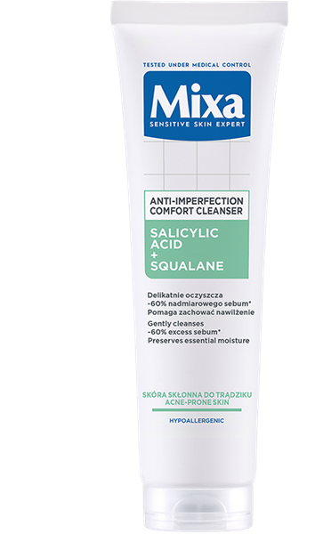 Idąc za radą ekspertki, warto postawić na żel oczyszczający do twarzy przeciw niedoskonałościom z kwasem salicylowym i skwalanem od marki Mixa. Kosmetyk ten delikatnie i skutecznie pozwala oczyścić skórę twarzy i dekoltu, a więc przygotować ją do dalszych etapów rutyny pielęgnacyjnej. Za jego działanie odpowiadają przede wszystkim dwa składniki:
