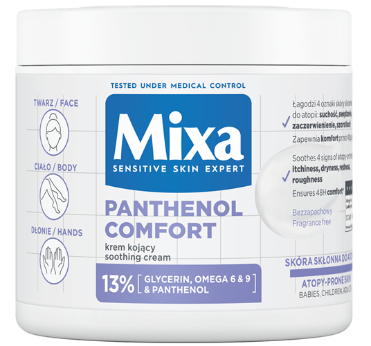 Uniwersalnym kosmetykiem, który zadba o ukojenie po opalaniu i nie tylko po nim, jest multifunkcyjny krem Mixa Panthenol Comfort. Jedna formuła sprawdzi się do pielęgnacji twarzy, ciała i dłoni. Za szybką ulgę, którą przynosi skórze, odpowiada 13% formuła, w której znajdują się: