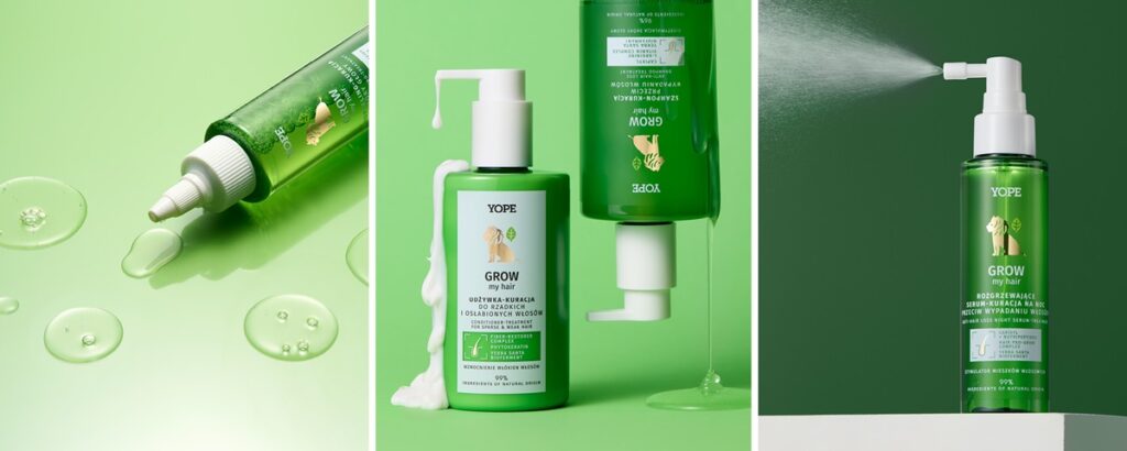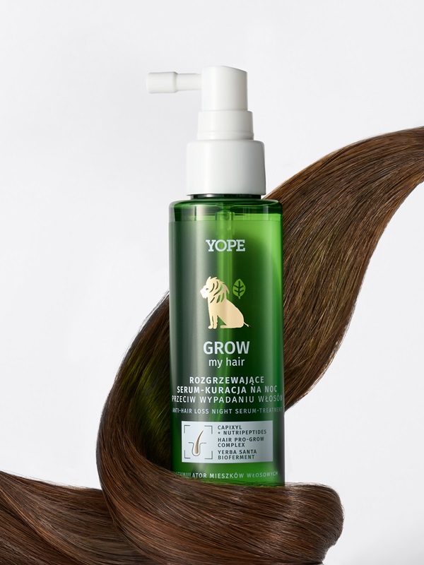 Więcej włosów, mniej wypadania! Odkryj linię YOPE  GROW my hair To zaawansowana, czteroetapowa kuracja stworzona z myślą o włosach osłabionych, przerzedzonych i wypadających. Dzięki nowatorskim, naturalnym składnikom takim jak –  Capixyl, bioferment z Yerba Santa i kompleksy protein, włosy stają się gęstsze, odżywione i wzmocnione. nasady aż po same końce!