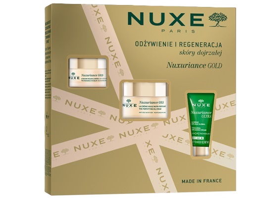 Zawiera: Nuxuriance GOLD Ultraodżywczy olejkowy krem do twarzy 50 ml, Nuxuriance GOLD Rozświetlający balsam pod oczy 15 ml, Nuxuriance ULTRA Krem przeciwstarzeniowy na dzień 15 ml